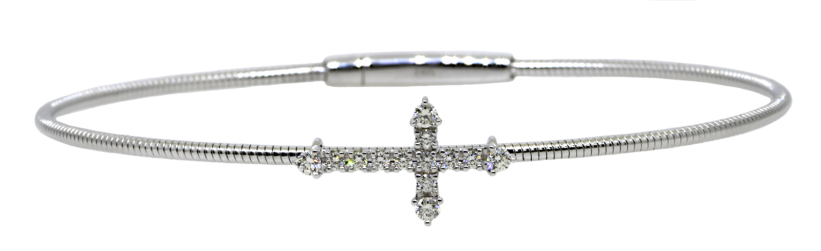 This bangle bracelet is a blend of timeless charm with thoughtful craftsmanship. Crafted from 14KW, this bangle bracelet features a cross incrusted with diamonds.