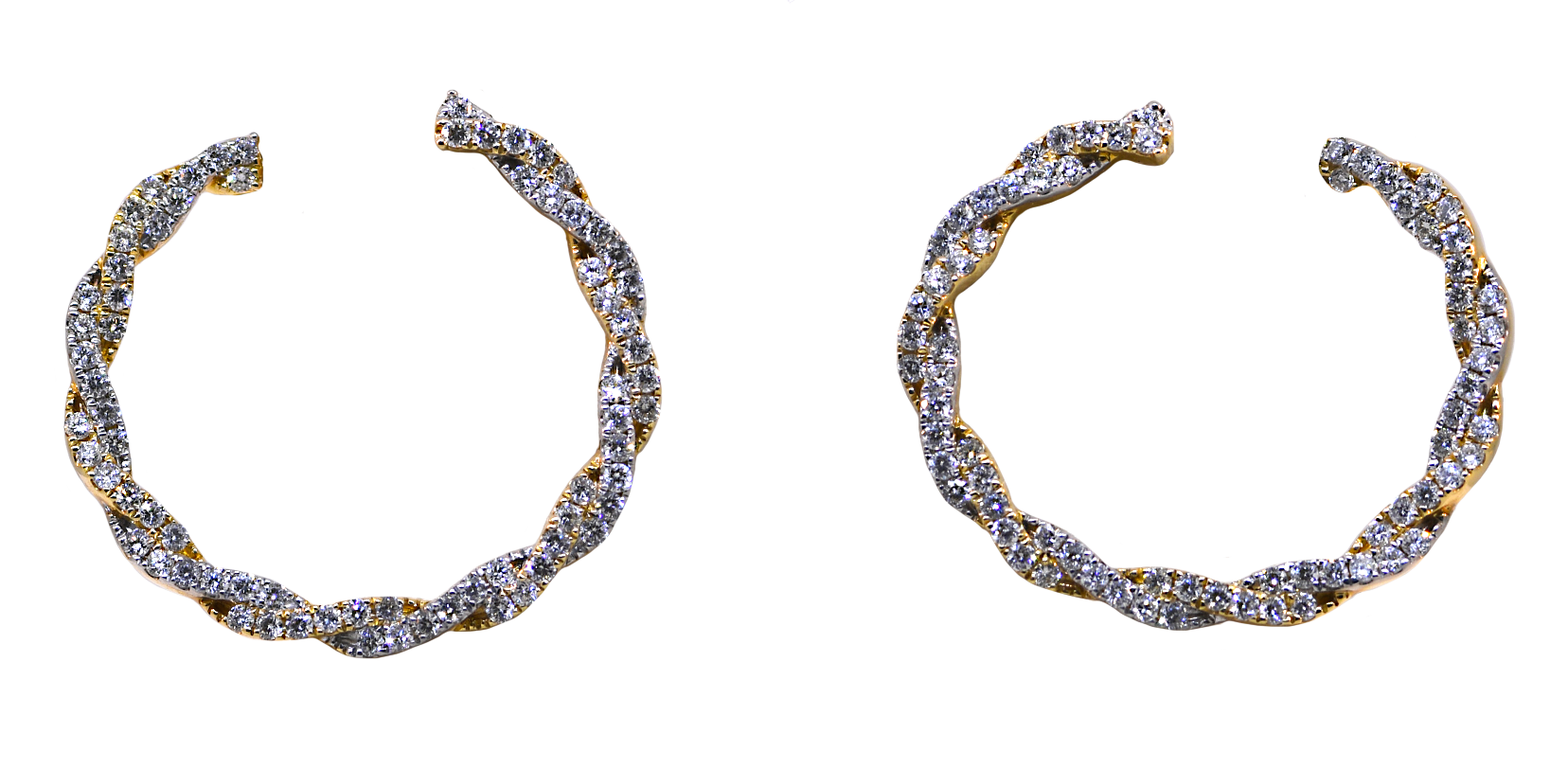 These elegant 14K yellow gold hoop earrings showcase a captivating twisted silhouette adorned with sparkling pavé diamonds. The refined design combines timeless appeal with contemporary flair, making them the perfect accessory for elevating any look. Whether you're dressing up for a special occasion or adding sophistication to your everyday style, these versatile hoops deliver understated luxury and enduring elegance.