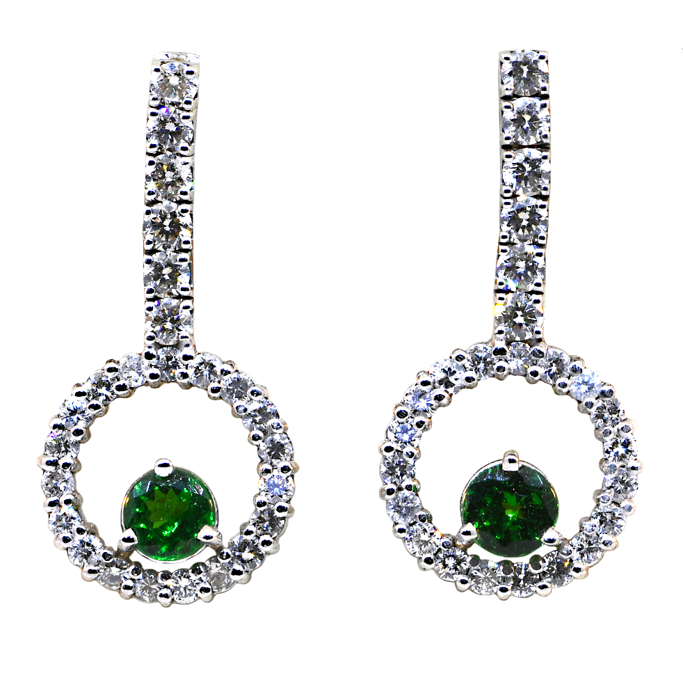 These elegant 18K white gold earrings showcase the perfect marriage of luxury and color. Each piece suspends a brilliant diamond encircling a stunning tsavorite gemstone, creating a captivating interplay of sparkle and vivid green hue. The refined dangle design adds graceful movement, making these earrings an irresistible choice for those seeking sophisticated everyday elegance or a memorable special occasion accessory.