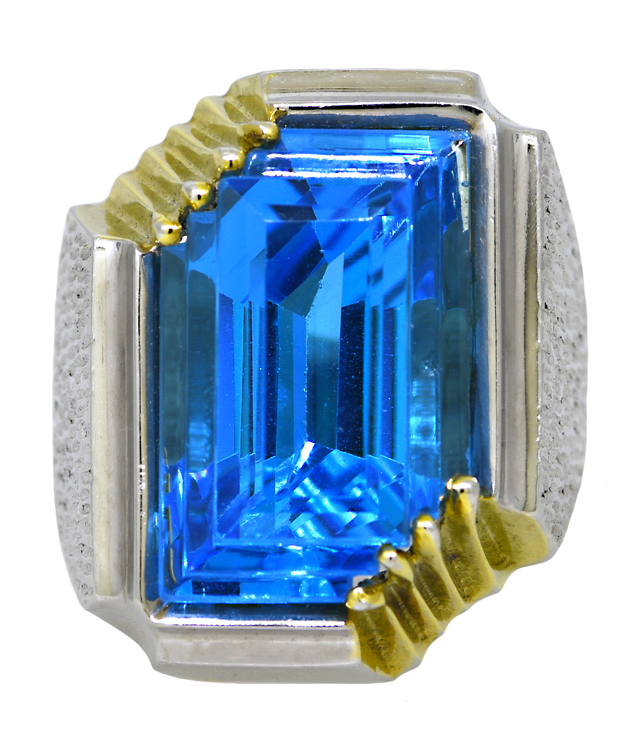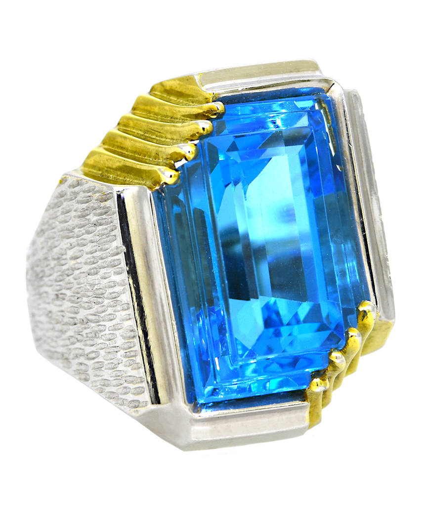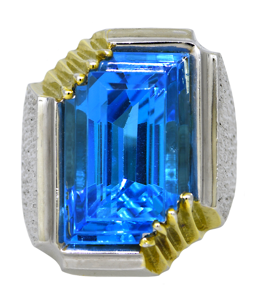This striking men's ring combines the timeless elegance of 14K white and yellow gold with a captivating blue topaz centerpiece. The vibrant gemstone catches the light beautifully, making it an ideal choice for those seeking a distinctive piece that balances sophistication with bold color. Perfect for everyday wear or special occasions, this ring delivers both style and substance.