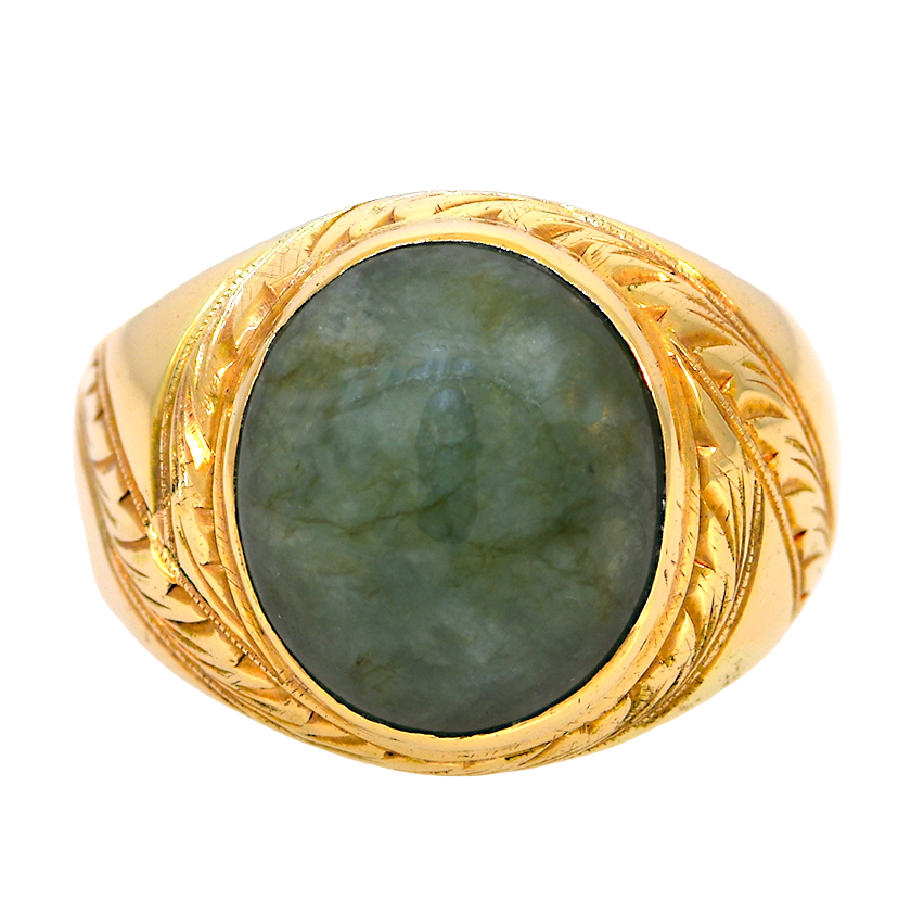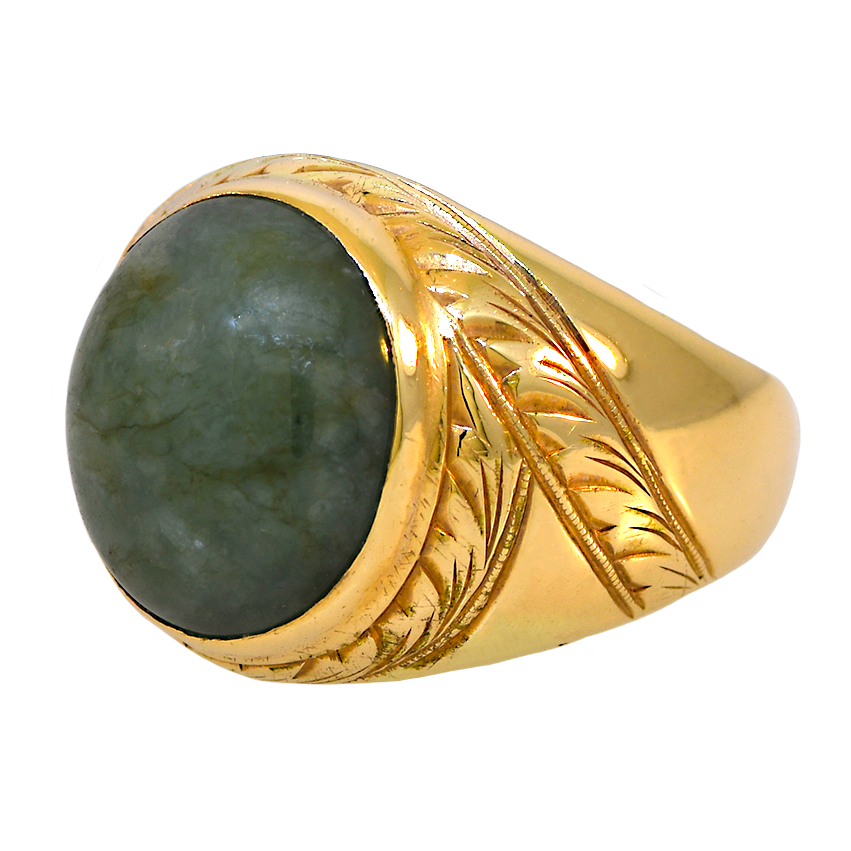 This distinguished men's ring showcases a striking round jade stone set in lustrous 14K yellow gold. The vibrant green gemstone radiates timeless elegance, while the warm gold setting enhances its natural beauty. Perfect for the man who appreciates classic sophistication and meaningful jewelry, this estate piece combines enduring style with genuine craftsmanship.