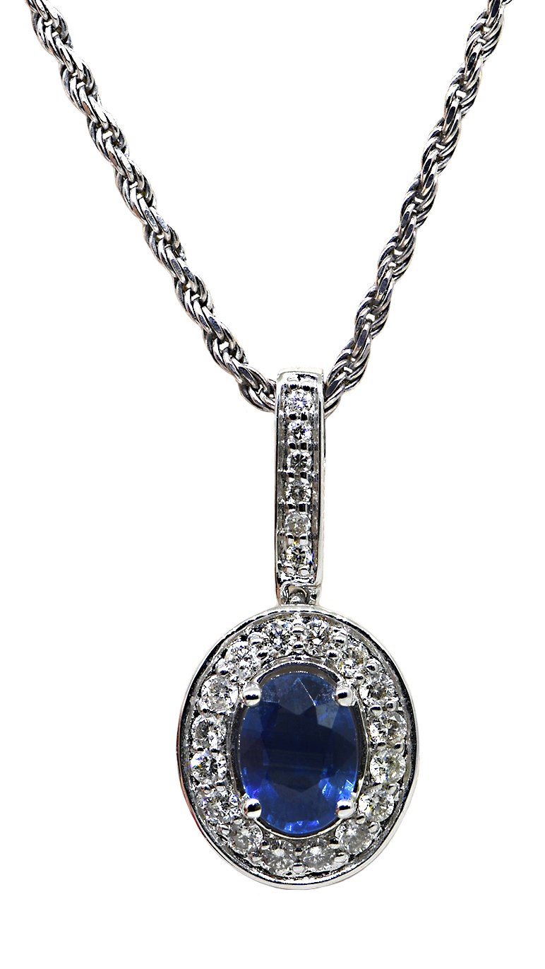 This elegant 14K white gold pendant showcases a stunning sapphire at its heart, beautifully framed by sparkling diamonds. A timeless piece that combines rich color with brilliant sparkle, perfect for adding sophistication to any jewelry collection.