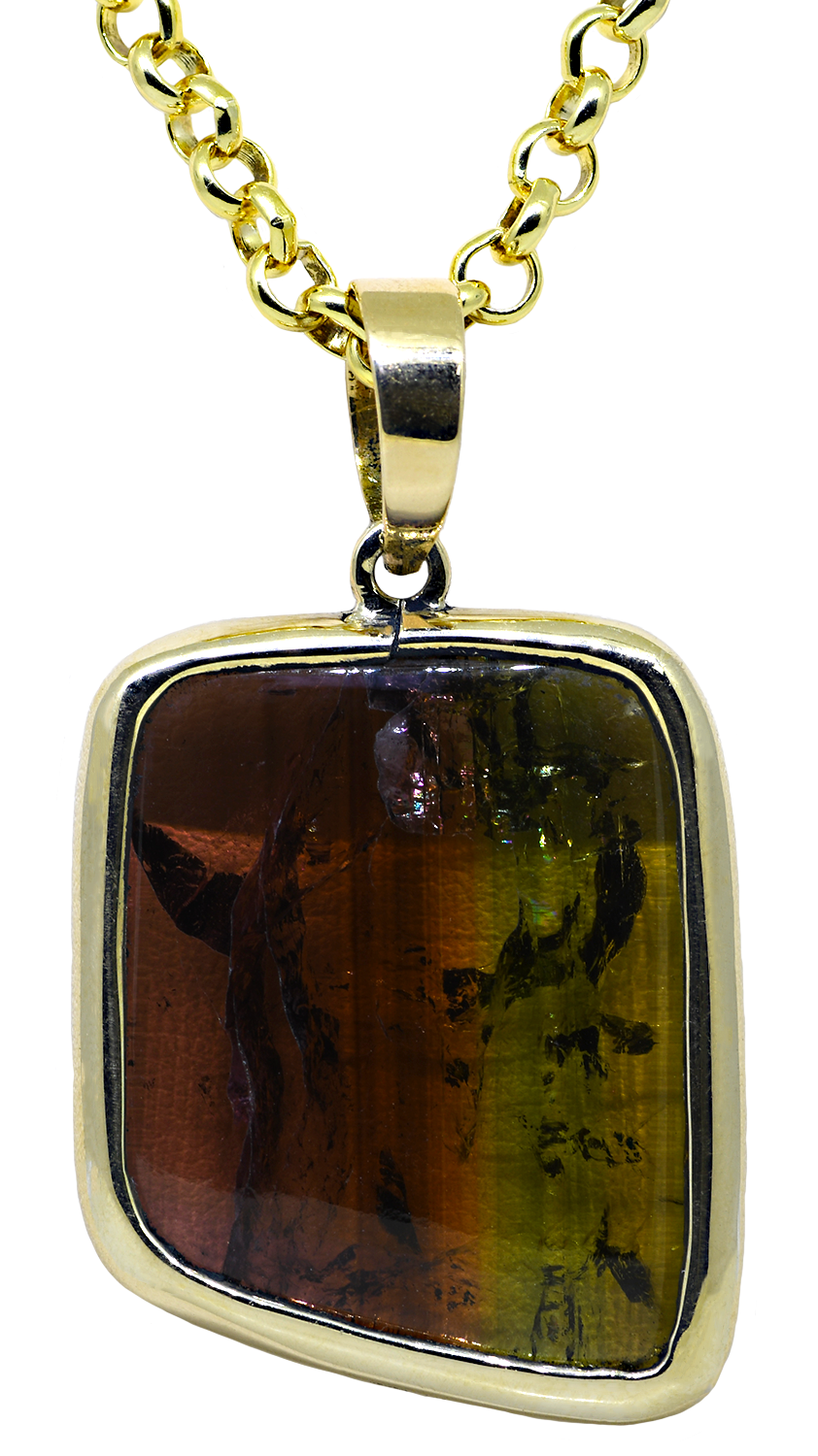 This exquisite pendant showcases a stunning bi-color tourmaline gemstone set in lustrous 14K yellow gold. The contrasting hues of the tourmaline create a captivating visual appeal, while the warm glow of yellow gold enhances its natural beauty. Perfect for those seeking a distinctive piece that combines elegance with the unique character of a genuine gemstone.