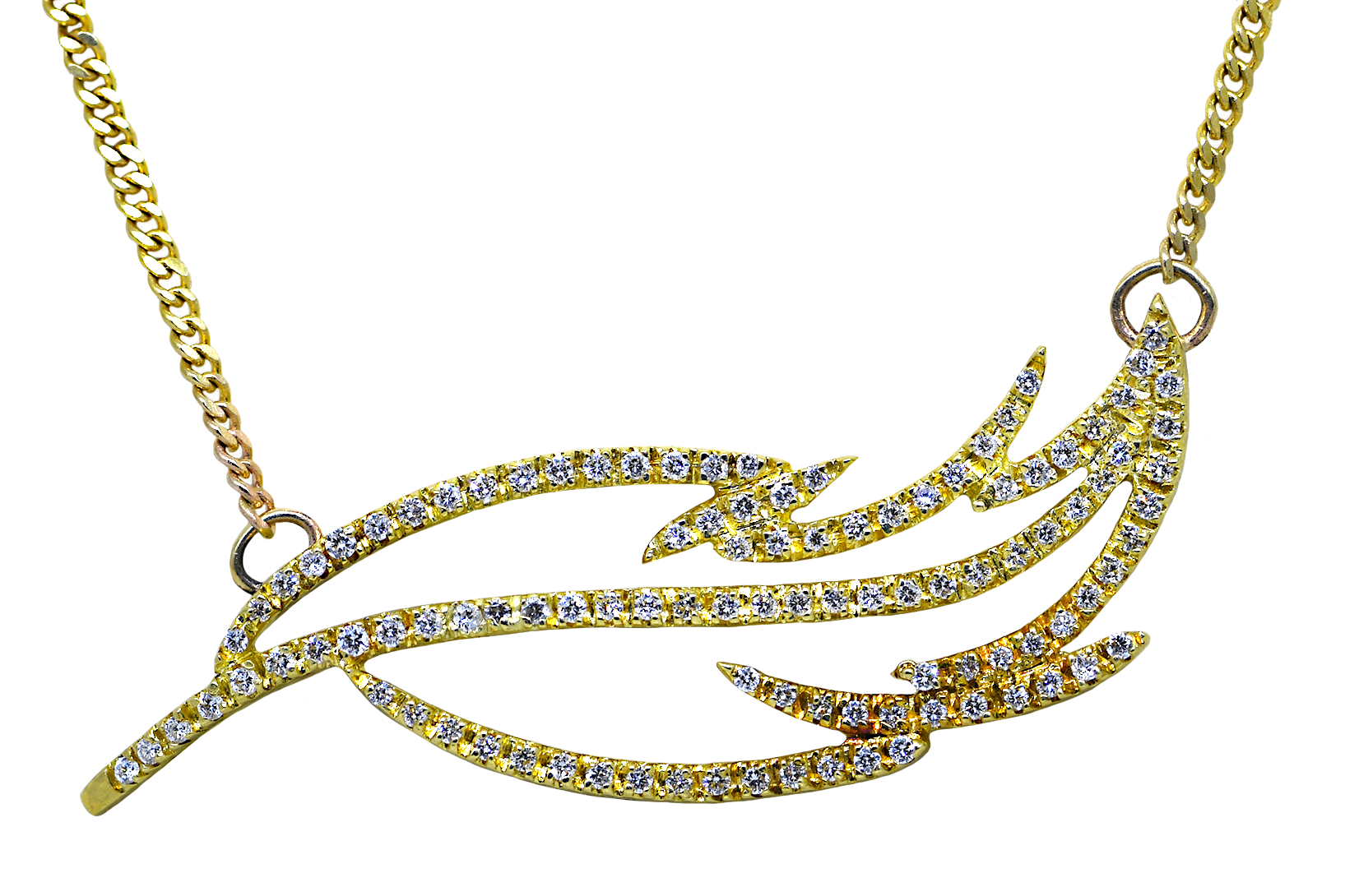 This elegant pendant showcases a delicate open-work leaf design adorned with brilliant diamonds, all fashioned in luxurious 18K yellow gold. A timeless piece that captures light beautifully and adds sophisticated sparkle to any ensemble.