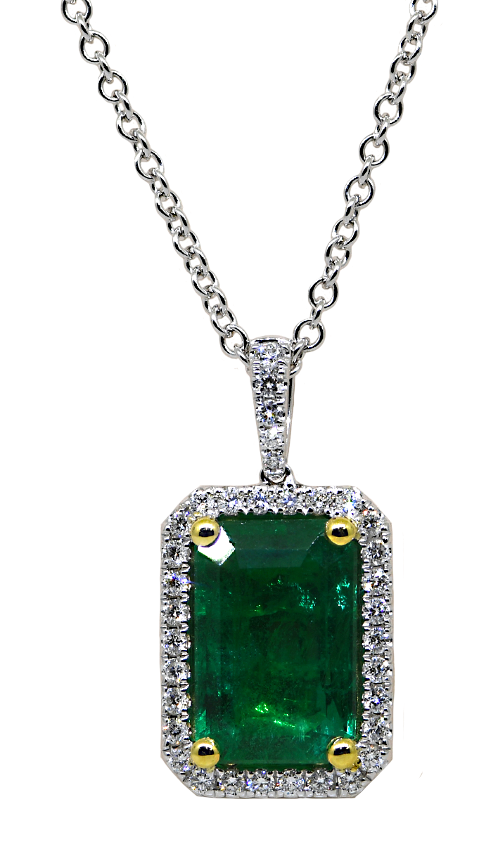 This exquisite pendant showcases a stunning emerald at its heart, elegantly framed by sparkling diamonds in lustrous 14K white gold. A timeless piece that captures attention with its rich green gemstone and brilliant accents, perfect for elevating any jewelry collection with sophisticated style and enduring elegance.