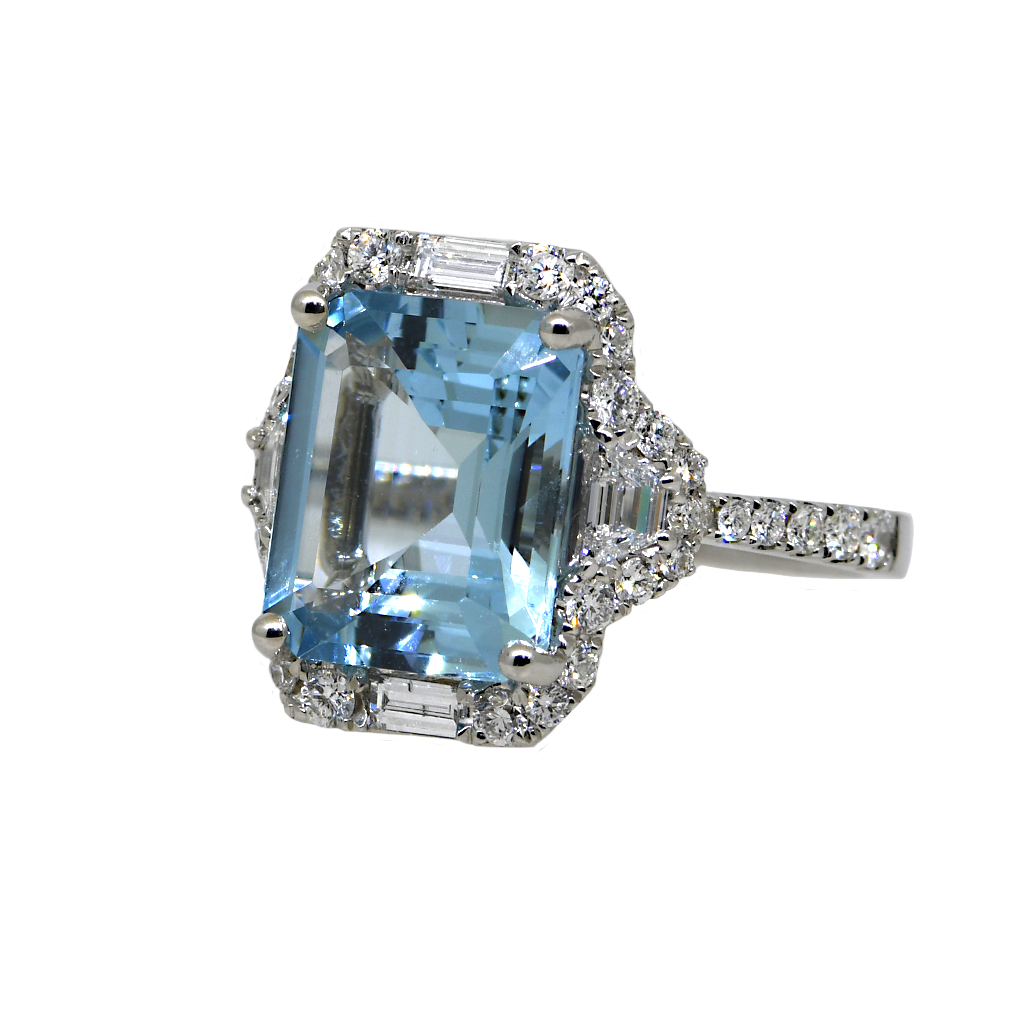 This stunning 18K white gold ring showcases a brilliant aquamarine gemstone as its focal point, elegantly framed by a halo of radiant diamonds. The cool, luminous tones of the aquamarine complement the sparkle of the surrounding diamonds, creating a sophisticated and eye-catching piece. Perfect for those who appreciate distinctive elegance and timeless beauty in fine jewelry.