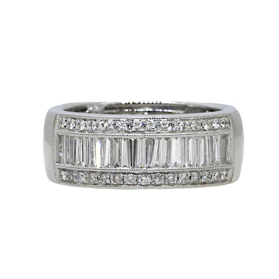 This elegant 18K white gold band showcases a stunning combination of baguette-cut diamonds flanked by brilliant round diamonds on both sides, creating a sophisticated and eye-catching design that complements any engagement ring or stands beautifully on its own.
