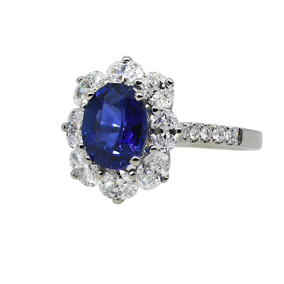 This exquisite 18K white gold ring showcases a stunning sapphire as its focal point, elegantly framed by a constellation of east-west oriented oval diamonds. The sophisticated design combines timeless luxury with contemporary styling, creating a piece that captures attention and admiration. Perfect for those who appreciate distinctive elegance and refined taste in fine jewelry.