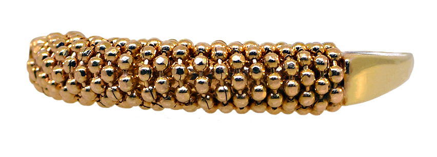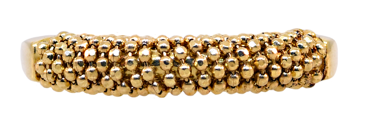 This elegant 14K rose gold ring showcases an intricate beaded design that catches the light beautifully. The textured pattern adds sophisticated dimension to your everyday jewelry collection, making it a versatile piece that complements any style while maintaining timeless appeal.