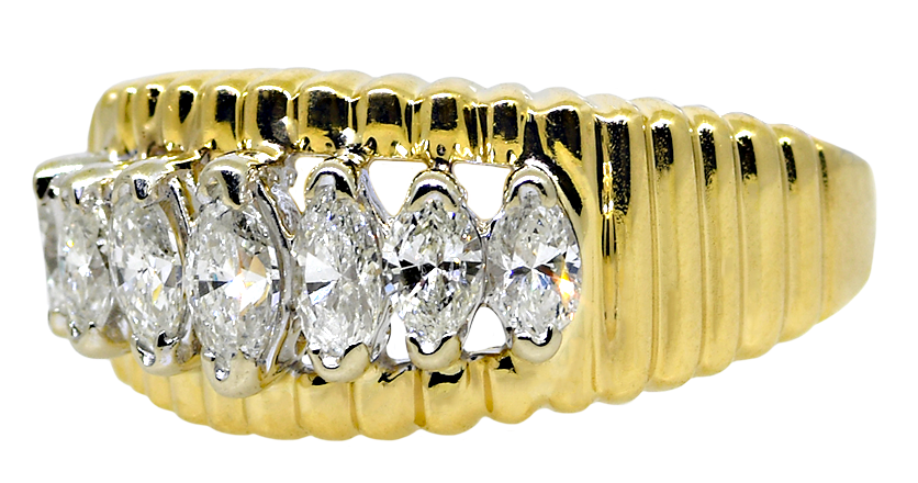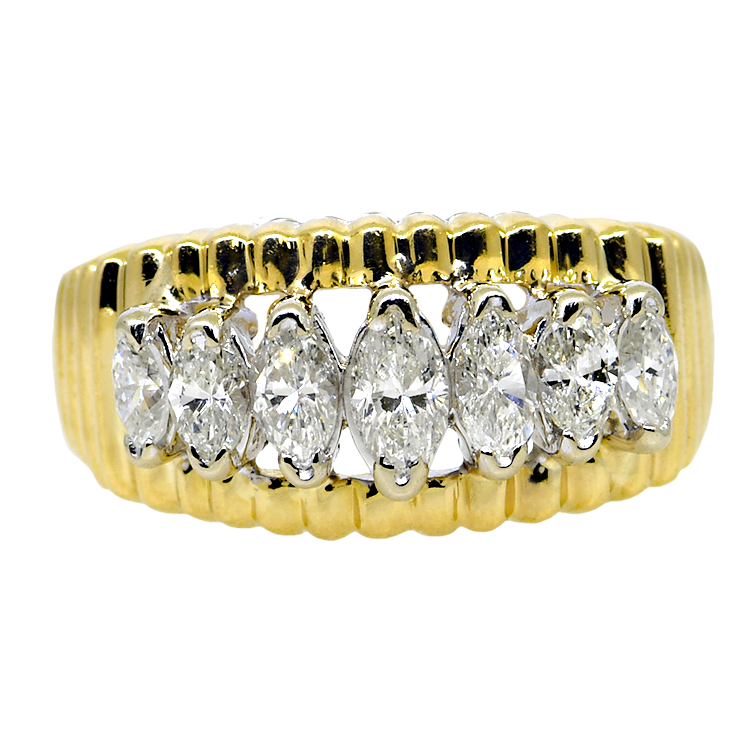 This stunning 14K yellow gold ring showcases seven exquisite marquise cut diamonds that catch light from every angle. The elegant ribbed band design adds sophisticated texture while the brilliant marquise stones create a captivating, elongated sparkle. Perfect for those who appreciate distinctive elegance and timeless luxury in fine jewelry.