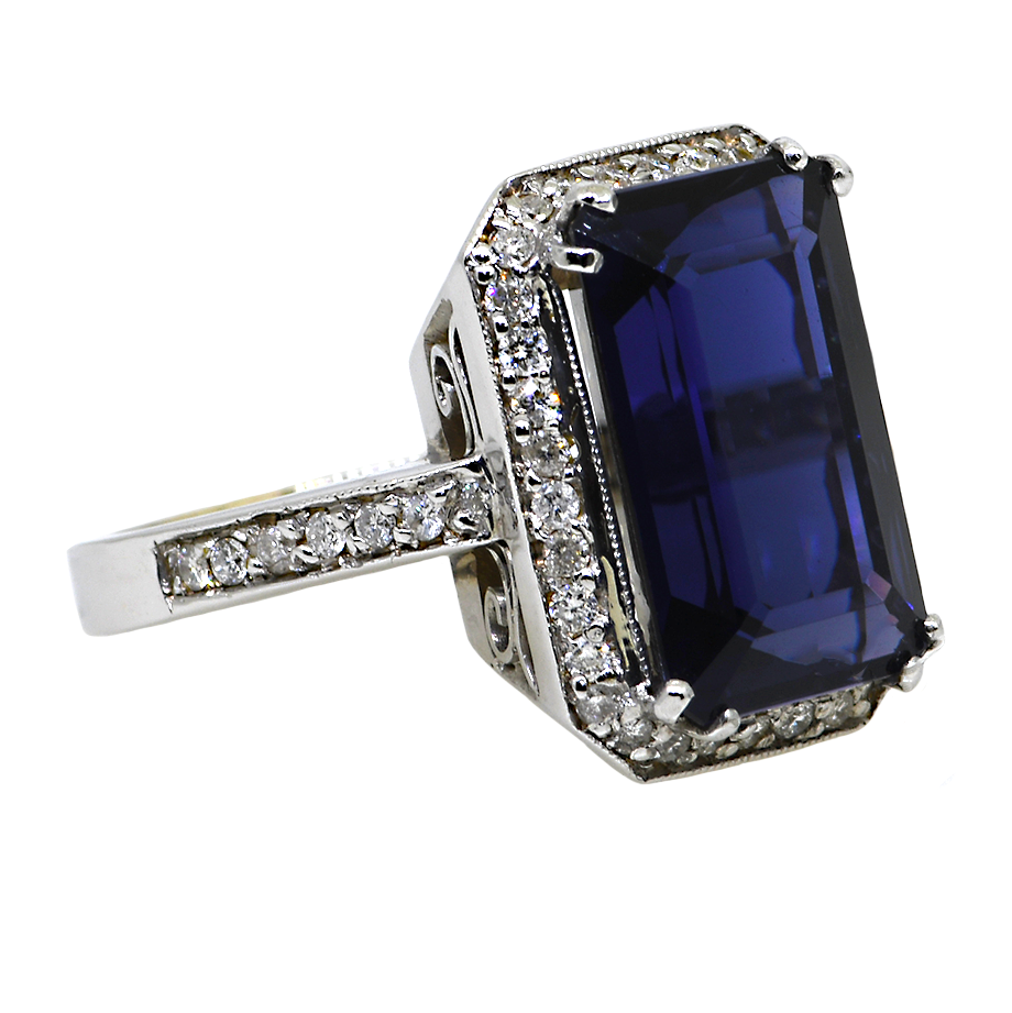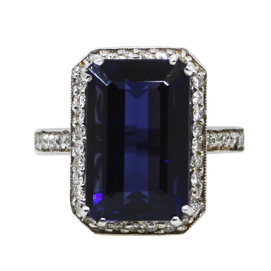 This exquisite 18K white gold ring showcases a stunning emerald-cut Lolite as its centerpiece, elegantly framed by brilliant diamonds that amplify its natural beauty. A sophisticated choice for those seeking a distinctive gemstone with timeless appeal and refined craftsmanship.