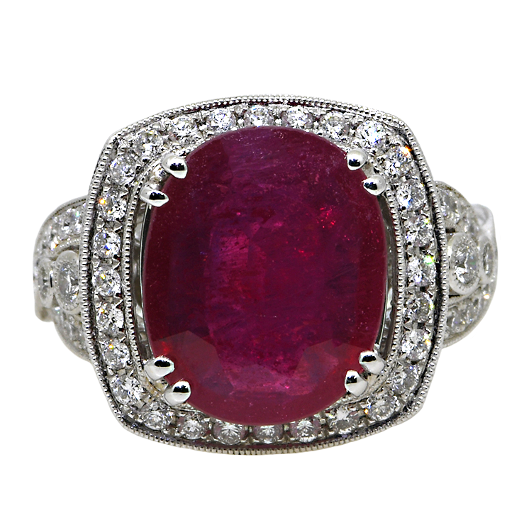 This stunning 18K white gold ring showcases a brilliant ruby at its heart, elegantly framed by sparkling diamonds that enhance its natural radiance. A timeless piece that captures both luxury and sophistication, perfect for those who appreciate fine gemstones and exceptional craftsmanship.