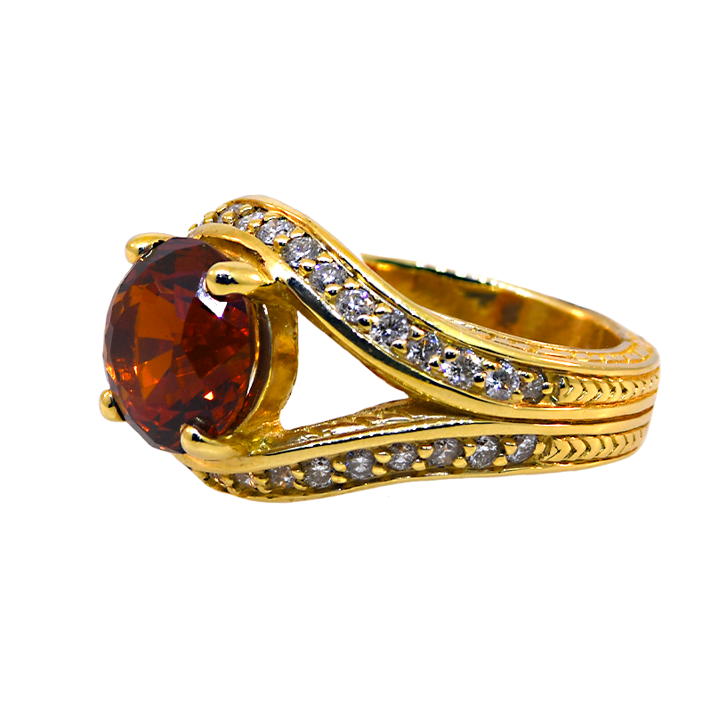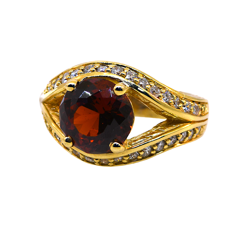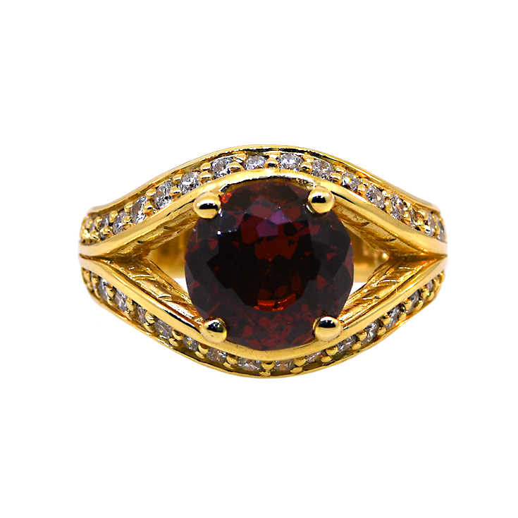 Crafted from 18K yellow gold, this ring features a vibrant garment center stone and incrusted diamonds in the band.