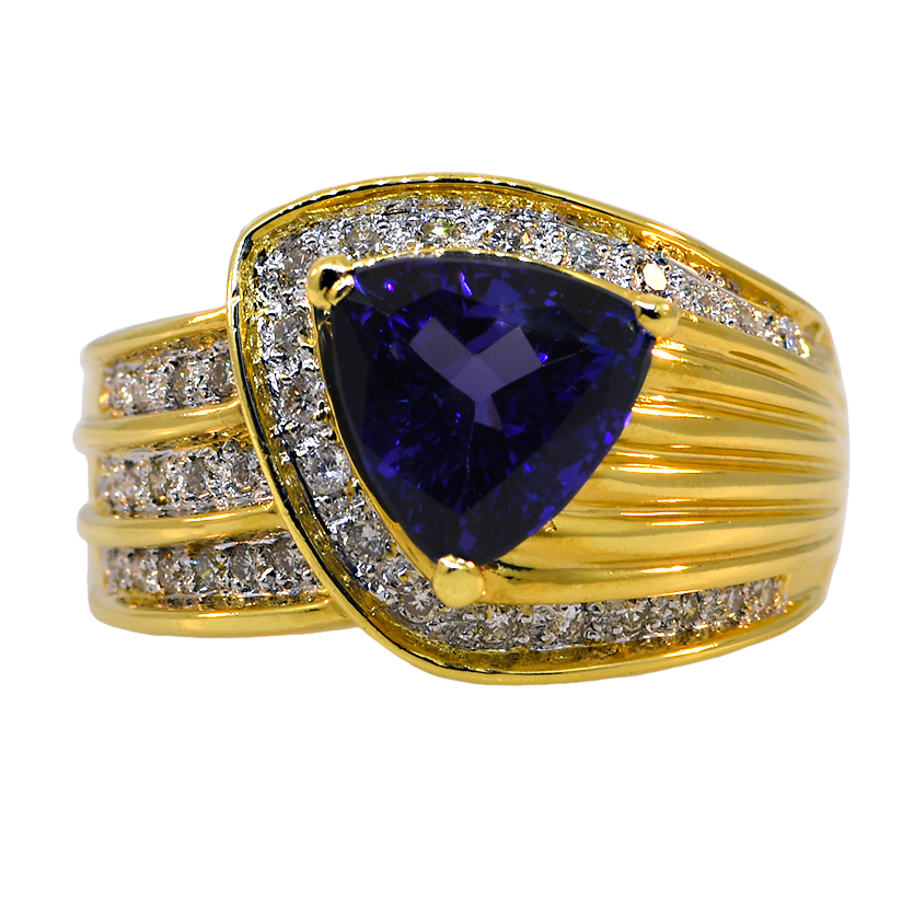 This stunning ring showcases the mesmerizing allure of a vivid tanzanite gemstone, elegantly set in luxurious 18K yellow gold and adorned with sparkling pave diamonds. A sophisticated choice for those seeking a distinctive piece that combines rare beauty with timeless elegance.