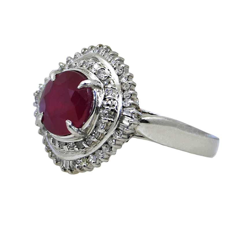 This exquisite platinum ring showcases a stunning treated ruby at its heart, brilliantly framed by a constellation of sparkling diamonds. A timeless piece that captures elegance and sophistication, perfect for those who appreciate bold color combined with classic luxury. The platinum setting ensures durability and a lustrous finish that will remain radiant for generations.