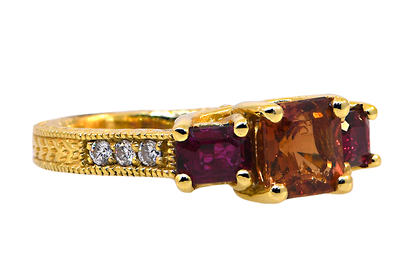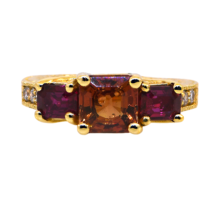 14KY Orange Sapphire and Ruby Ring with Diamonds