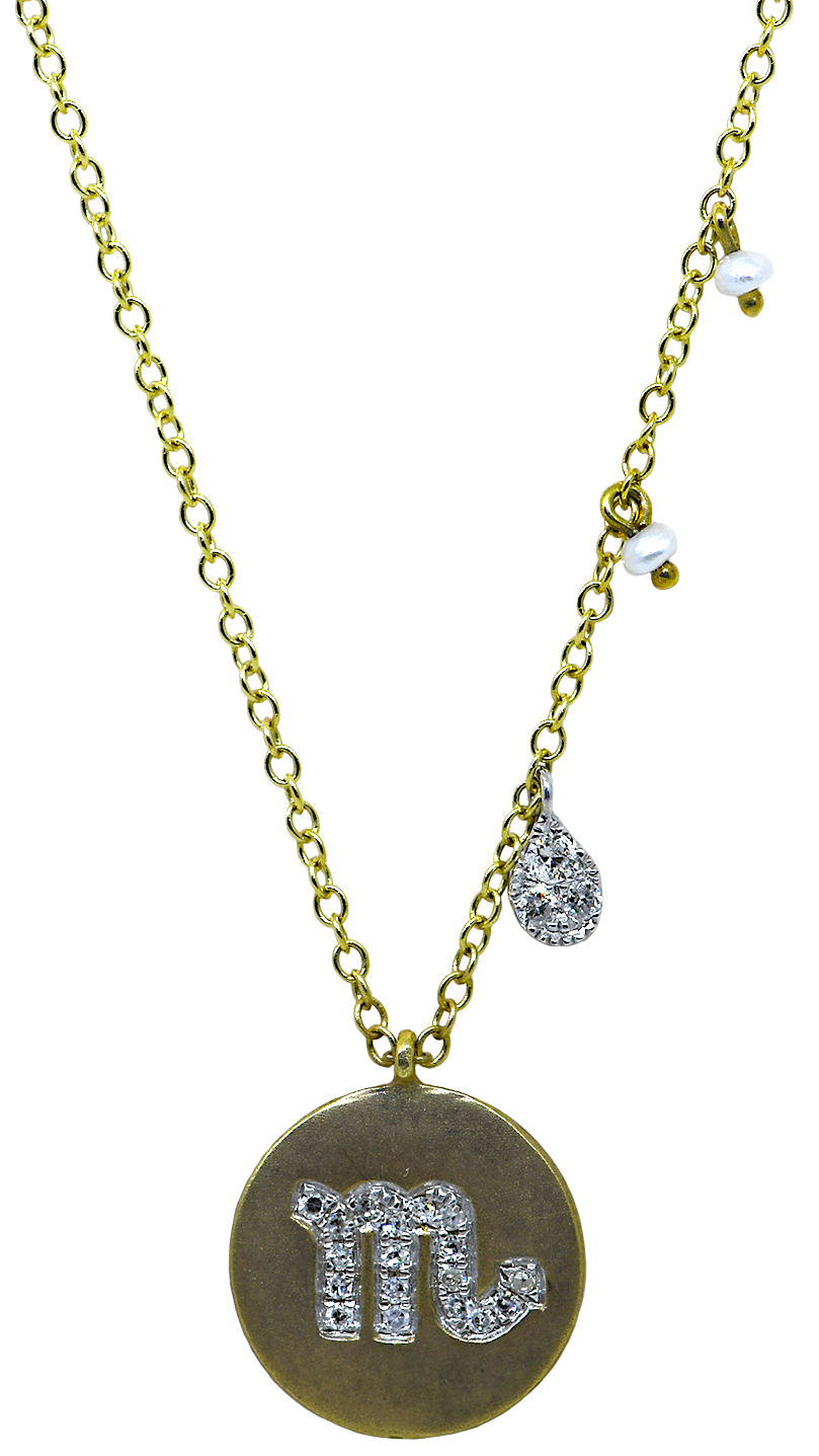 This stunning 14K yellow gold necklace celebrates your Scorpio spirit with an elegant disk pendant showcasing the zodiac symbol, beautifully adorned with sparkling diamonds. Delicate diamond and pearl accents dangle gracefully from the chain, adding movement and sophistication to this celestial piece. Perfect for astrology enthusiasts or as a meaningful gift, this necklace combines timeless luxury with personalized charm.