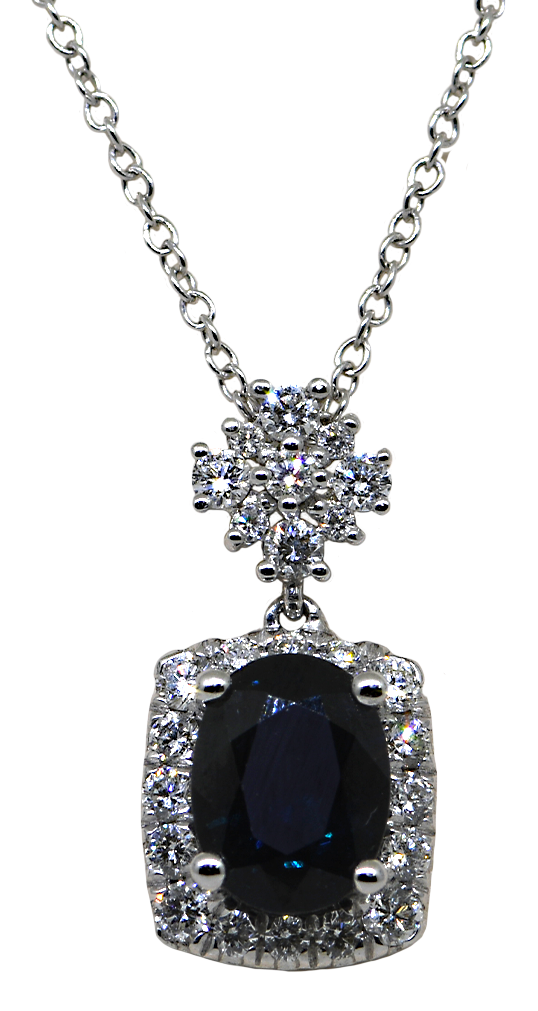 This elegant 14K white gold necklace showcases a stunning sapphire at its heart, brilliantly framed by sparkling diamonds. A timeless piece that captures light and attention, it's designed for those who appreciate refined luxury and distinctive style. Perfect for elevating any occasion with sophisticated glamour.