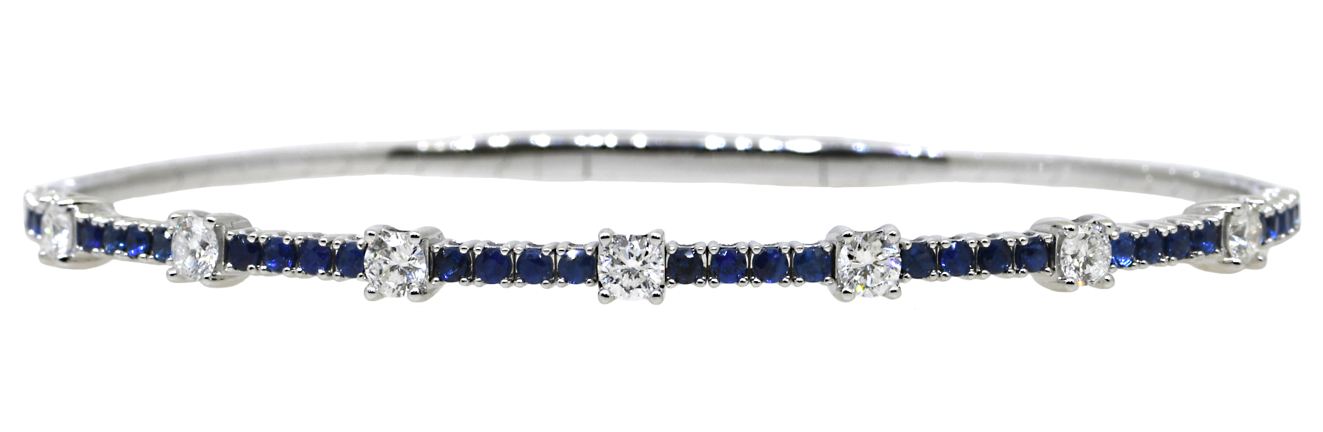 This elegant 14K white gold bangle showcases stunning round sapphires complemented by seven sparkling diamond accents positioned throughout the design. A timeless piece that combines rich color with brilliant sparkle, perfect for elevating any occasion with sophisticated style and enduring beauty.