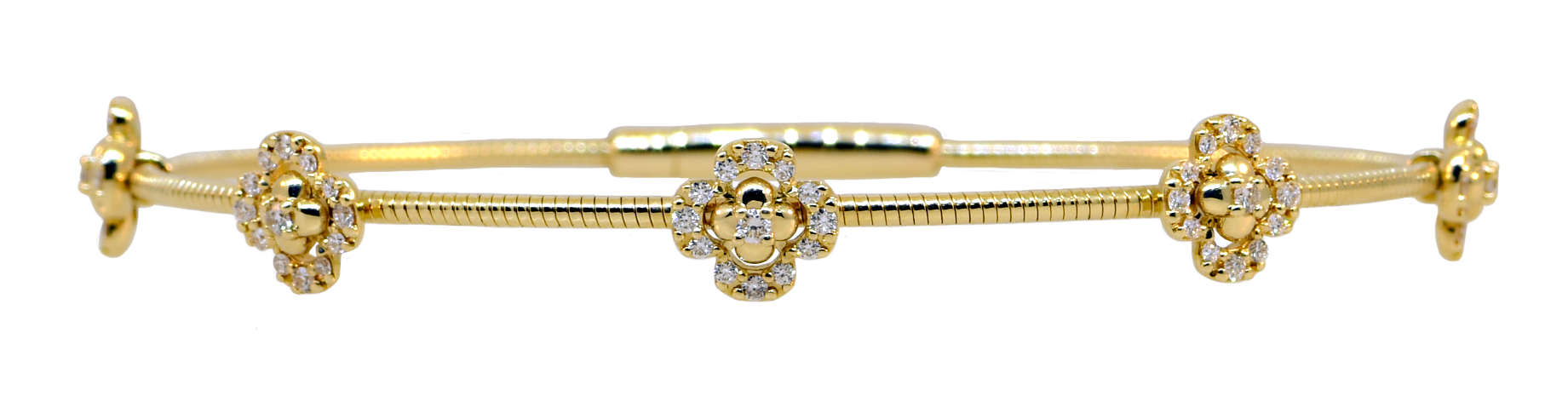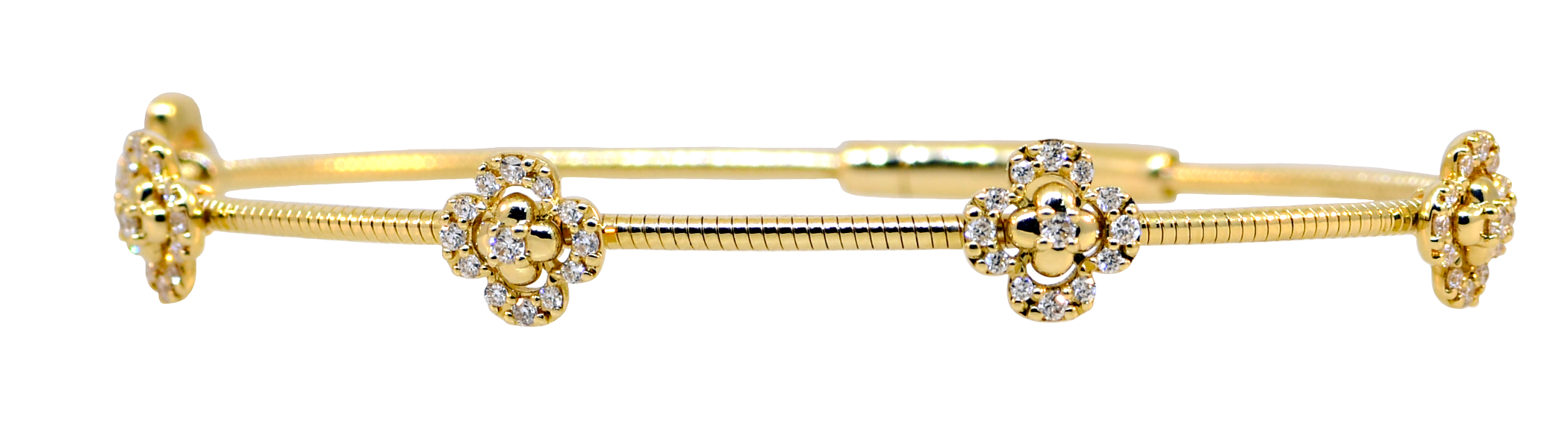 Elevate your everyday elegance with this stunning 14K yellow gold flexible diamond bangle bracelet. Five exquisite diamond studded flower stations catch the light beautifully, creating a sophisticated look that transitions seamlessly from day to night. The flexible design ensures a comfortable, secure fit that moves with you, while the timeless yellow gold and sparkling diamonds make this piece an investment in lasting style. Perfect for those who appreciate fine craftsmanship and understated luxury.
