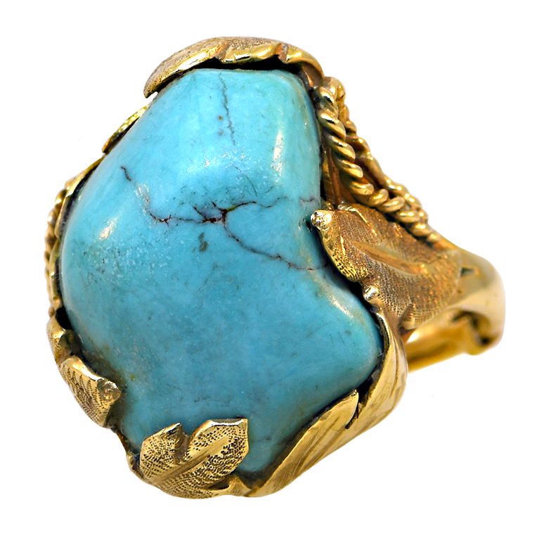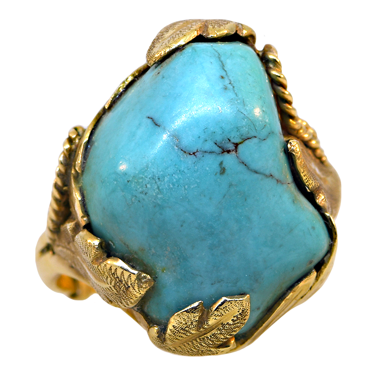 This stunning 14K yellow gold ring showcases intricate leaf motifs that frame a brilliant turquoise centerpiece. The warm glow of yellow gold beautifully complements the stone's rich, captivating hue, creating a timeless piece with distinctive character. Perfect for those seeking authentic vintage elegance with enduring appeal.