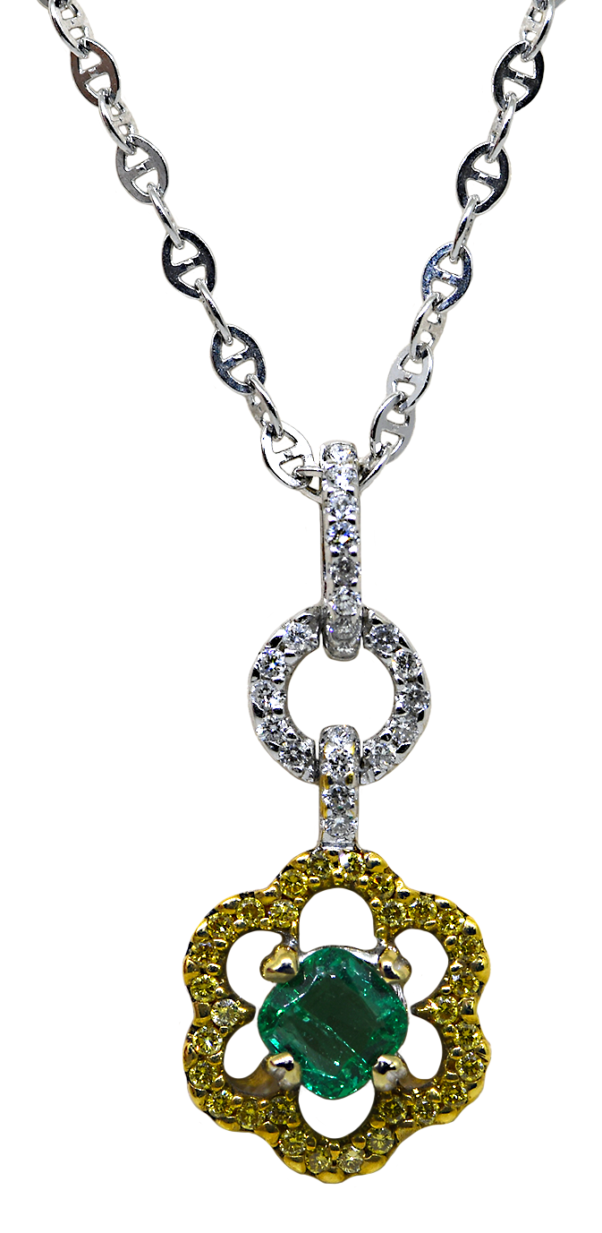 This exquisite necklace combines the timeless elegance of 18K gold with a stunning emerald focal point, delicately framed by a yellow gold floral design. Brilliant diamonds sparkle throughout the piece, creating a luminous contrast against the white gold setting. A true statement of sophistication, this necklace merges classic luxury with refined artistry, perfect for those who appreciate fine jewelry that captures both light and attention.