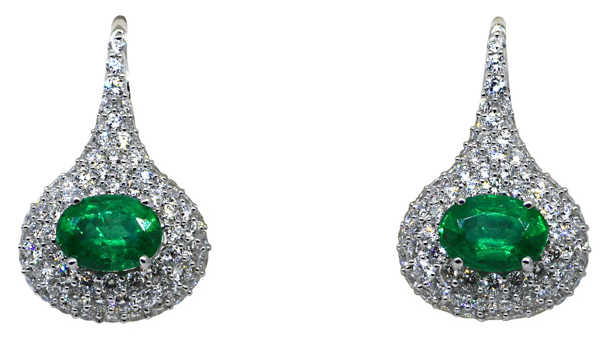 Elegant 18K white gold dangle earrings showcasing lustrous emeralds as the focal point, beautifully framed by sparkling pavé diamonds. These sophisticated pieces combine timeless design with luxurious materials, perfect for adding refined glamour to any occasion. The interplay of rich green emeralds and brilliant diamonds creates a captivating contrast that catches light from every angle, making these earrings a stunning statement accessory for the discerning jewelry lover.