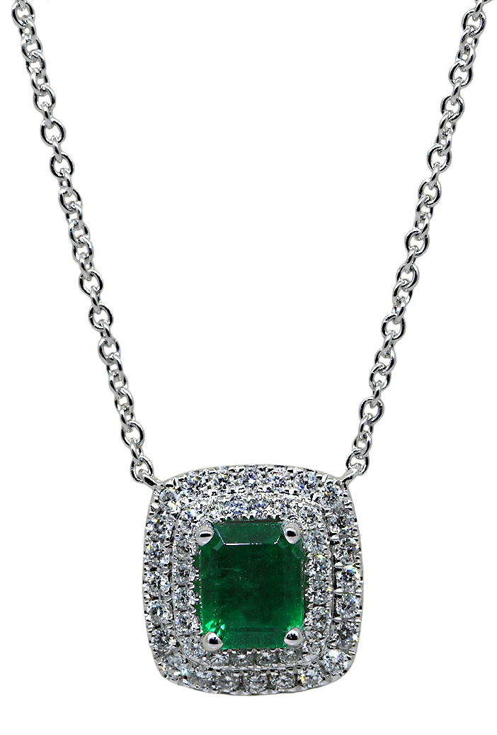 This stunning 18K white gold necklace showcases a radiant emerald as its centerpiece, elegantly framed by a halo of brilliant diamonds. The sophisticated design captures light beautifully, creating an eye-catching piece that transitions seamlessly from everyday elegance to special occasions. Perfect for those who appreciate timeless luxury and distinctive gemstone jewelry.