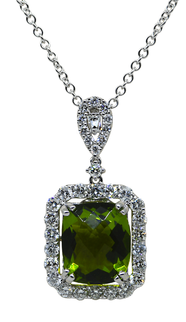 This exquisite pendant showcases the luminous beauty of a radiant peridot, elegantly framed by brilliant diamonds and set in luxurious 18K white gold. The striking contrast between the stone's warm, verdant glow and the cool sparkle of diamonds creates an enchanting piece that captures light from every angle. Perfect for those who appreciate distinctive gemstones with timeless sophistication, this pendant makes a refined statement whether worn daily or reserved for special occasions.