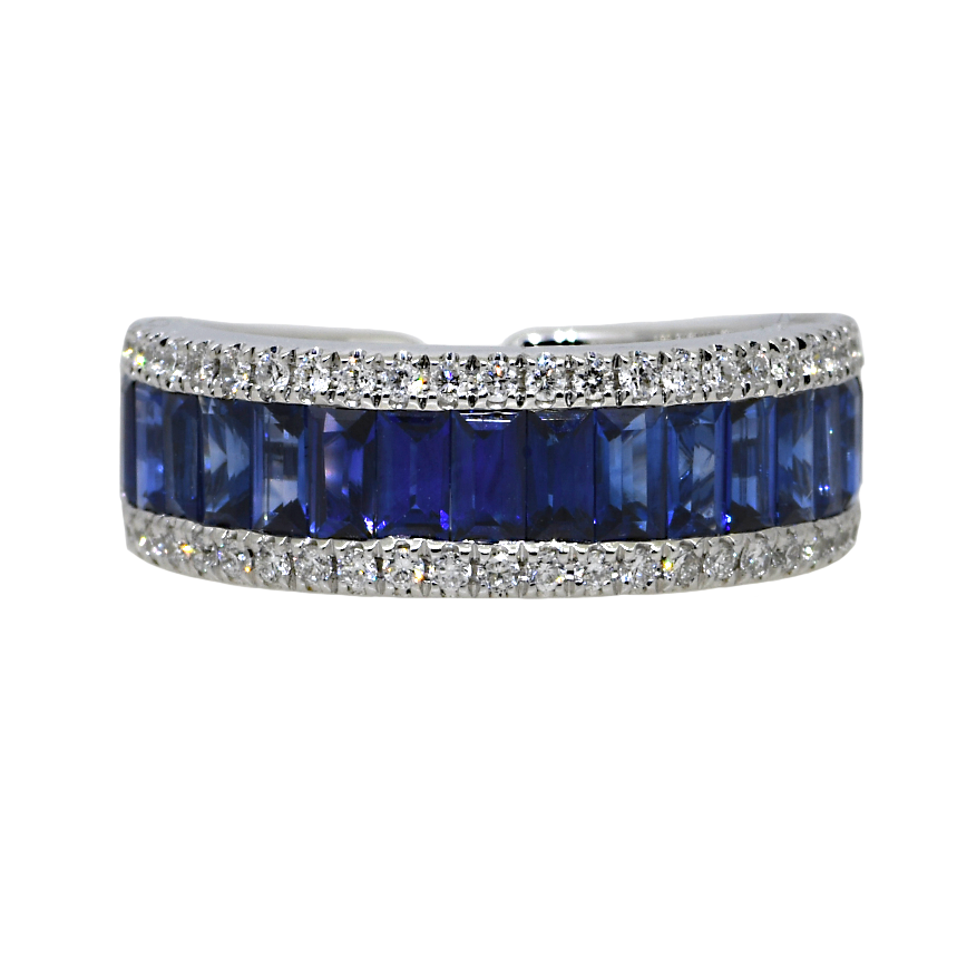 This elegant band showcases the timeless appeal of 18K white gold paired with striking baguette sapphires and radiant diamonds. The sophisticated interplay of deep blue sapphires and brilliant diamonds creates a captivating design that complements any jewelry collection. Perfect for those seeking refined luxury with understated elegance.