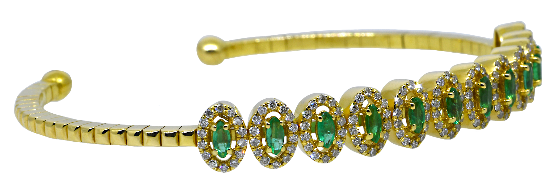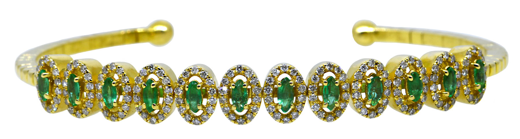 This stunning cuff bracelet showcases the timeless elegance of 18K yellow gold paired with vibrant emeralds nestled within sparkling diamond halos. Each oval-shaped halo frame amplifies the emeralds' rich color while the surrounding diamonds catch light from every angle, creating an eye-catching piece that commands attention. Perfect for elevating any occasion, this bracelet combines luxury materials with sophisticated design for a truly memorable accessory.