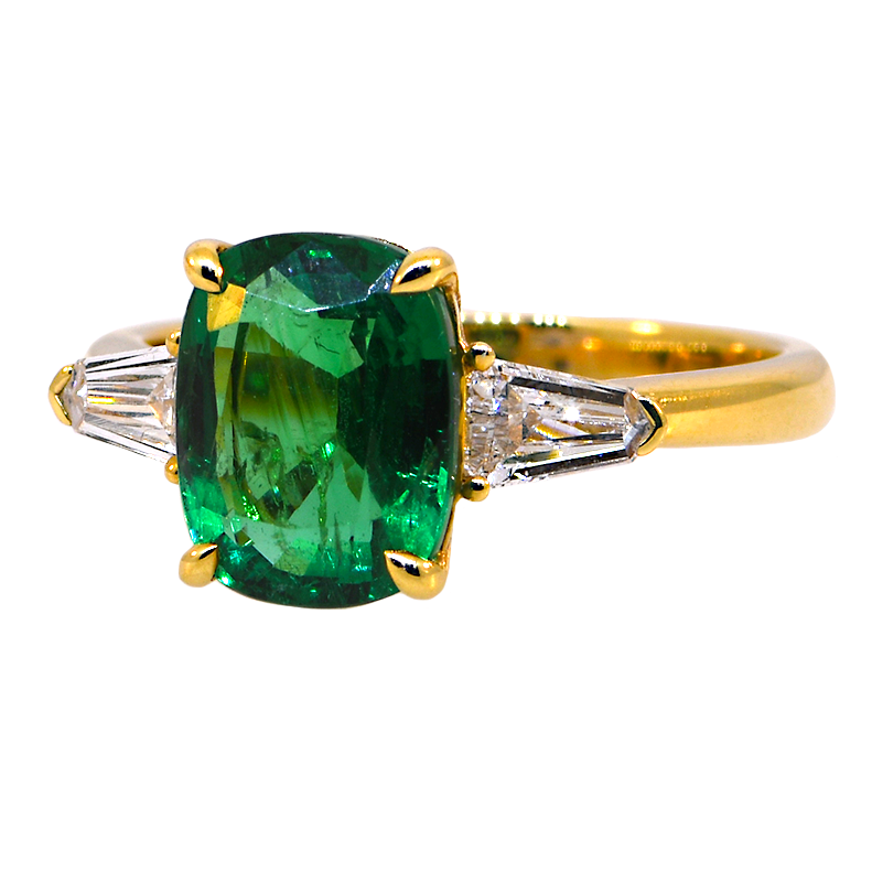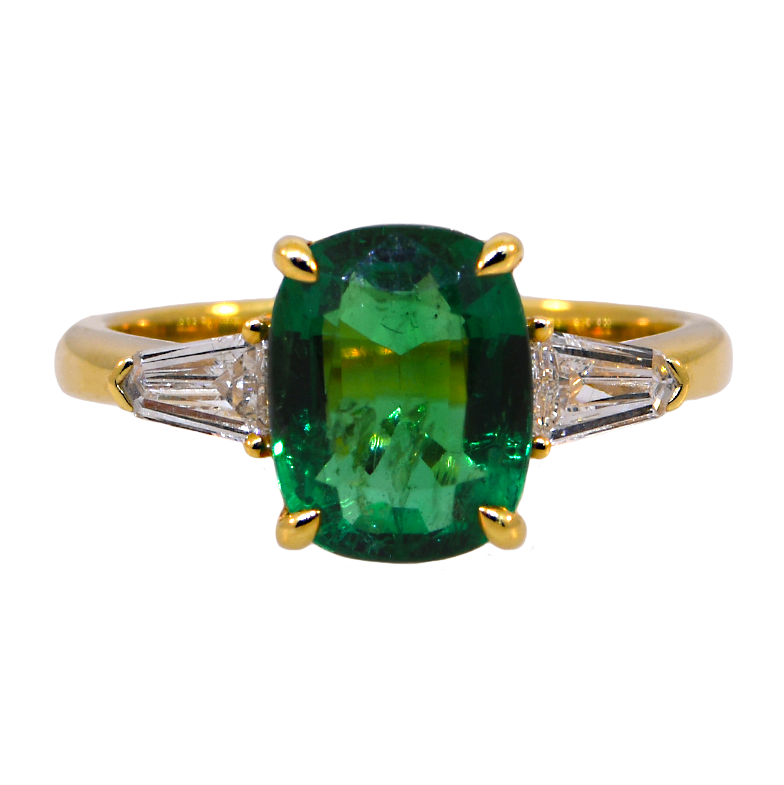 This stunning 18K yellow gold ring showcases a captivating cushion-cut emerald as its centerpiece, elegantly framed by sparkling diamonds on either side. The warm glow of yellow gold perfectly complements the rich, verdant beauty of the emerald, creating a timeless piece that commands attention. Ideal for those who appreciate distinctive elegance and the sophisticated allure of precious gemstones, this ring makes an unforgettable statement for any occasion.