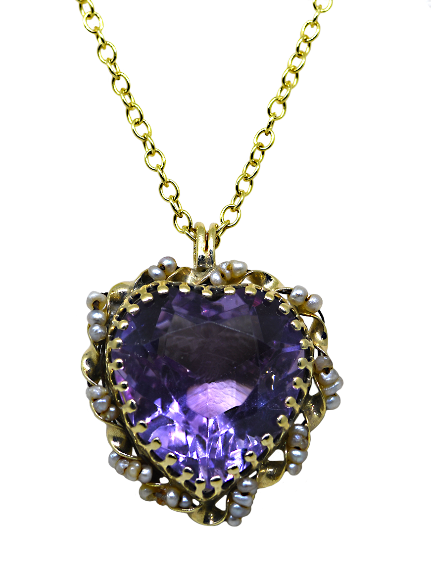 For all lovers of antique pieces, this one is for you. Crafted from 14K yellow gold, this pendant features a vibrant, heart shaped amethyst surrounded with beautiful seed pearls.