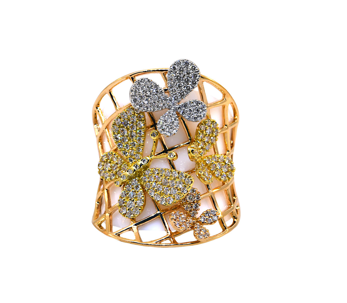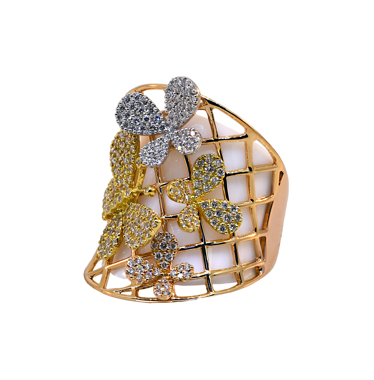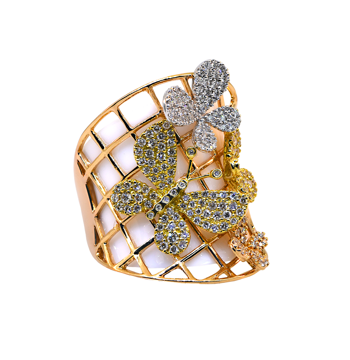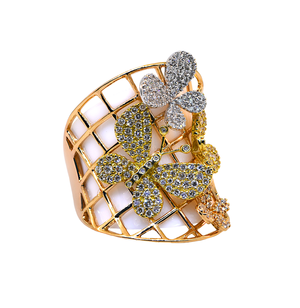 Crafted from 18K rose, yellow, and white gold, this ring features multi colored gold, pave butterflies that sparkle when the light reflects off of them.